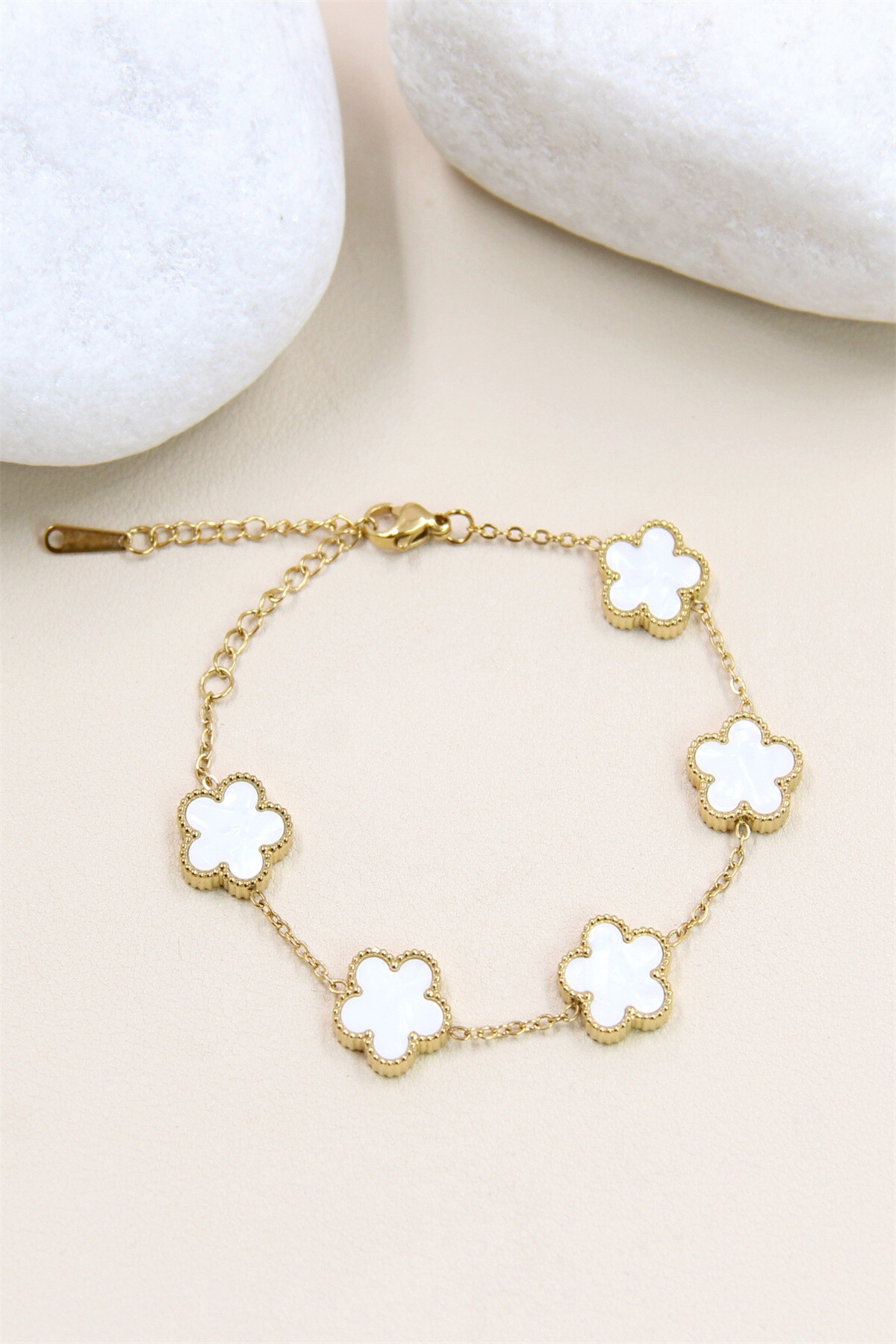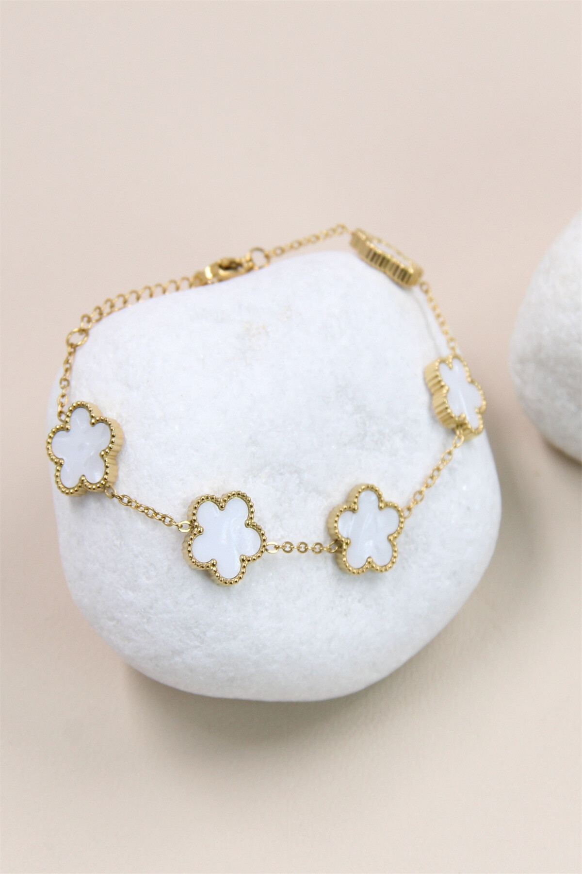 Ce bracelet en acier inoxydable doré est orné de cinq charms en forme de trèfle, chacun incrusté de nacre. Les charms sont reliés par une chaîne délicate, ajoutant une touche de sophistication et de charme. Le fermoir mousqueton doré assure une fixation sécurisée et durable, parfait pour agrémenter vos tenues avec une note de raffinement et d’élégance intemporelle.
