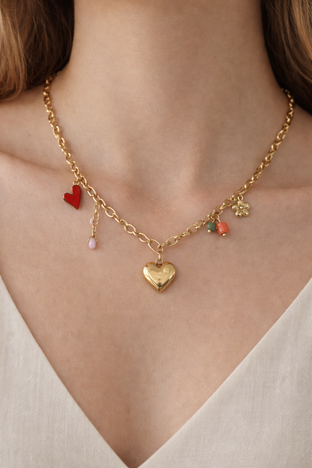 Le coeur a des contours doux, la fleur des pétales fins. Les breloques oscillent agréablement.