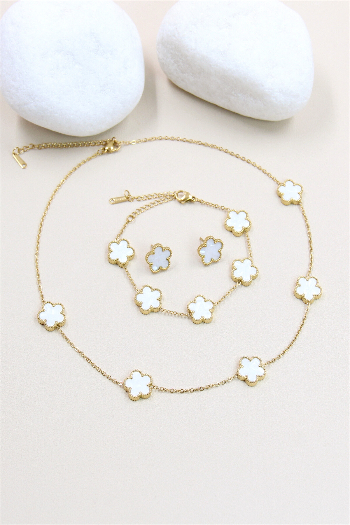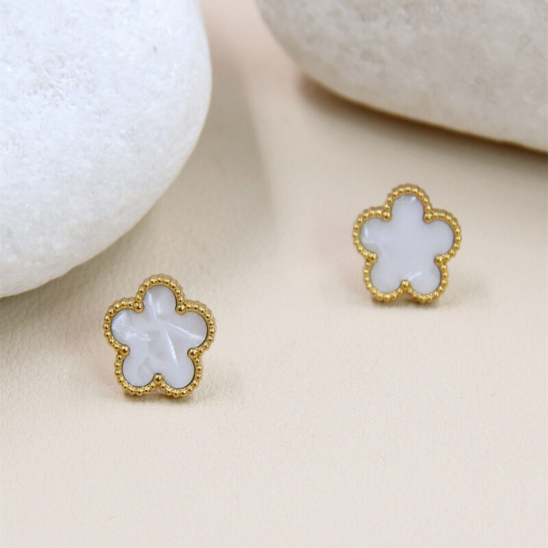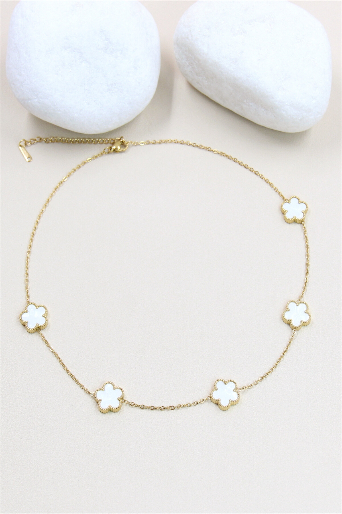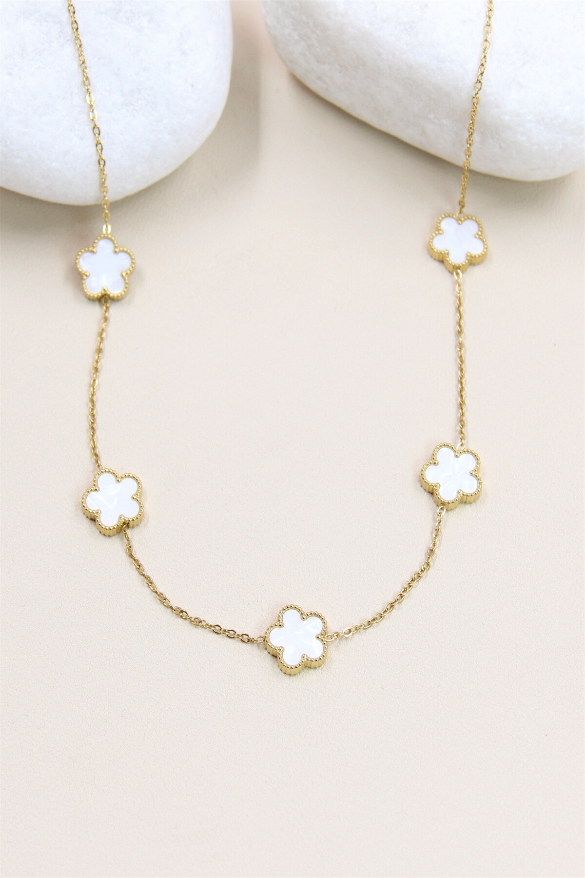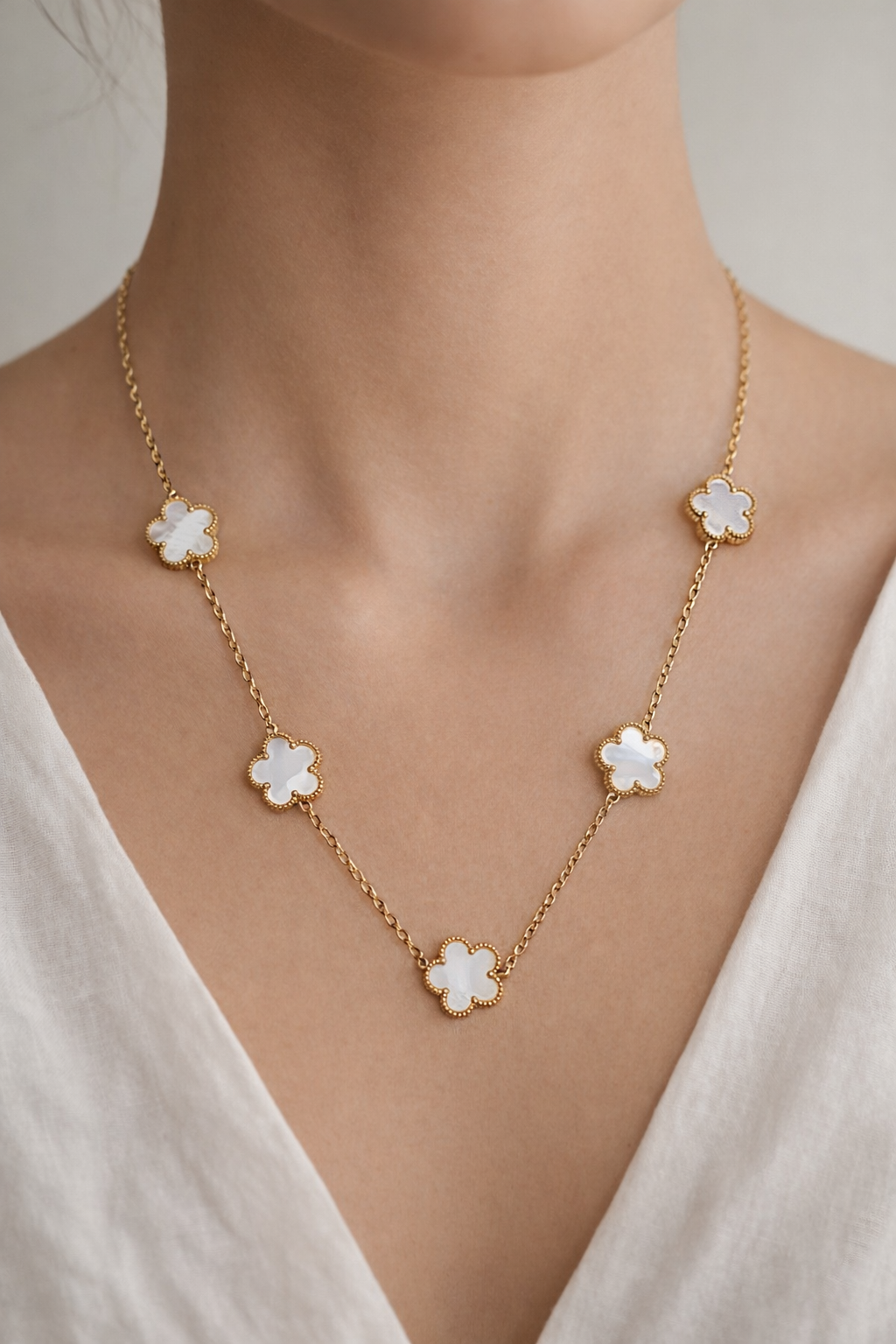Ce collier en acier inoxydable doré est orné de cinq pendentifs en forme de trèfle, chacun incrusté de nacre. Les trèfles, entourés d’un bord doré, ajoutent une touche de sophistication et de charme à votre style. La chaîne fine et délicate relie les pendentifs de manière uniforme, créant un motif élégant et harmonieux. Parfait pour agrémenter vos tenues avec une note de raffinement et d’élégance intemporelle.